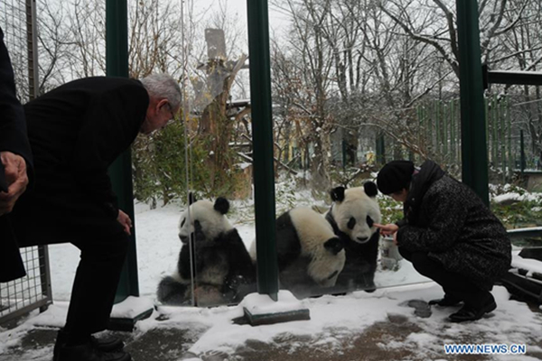 Austrian President Alexander Van der Bellen visited the panda twins, Fu Feng and Fu Ban, at Zoo Vienna on Saturday to say goodbye as the pandas will return to Sichuan province, the hometown of giant pandas in China on Sunday.