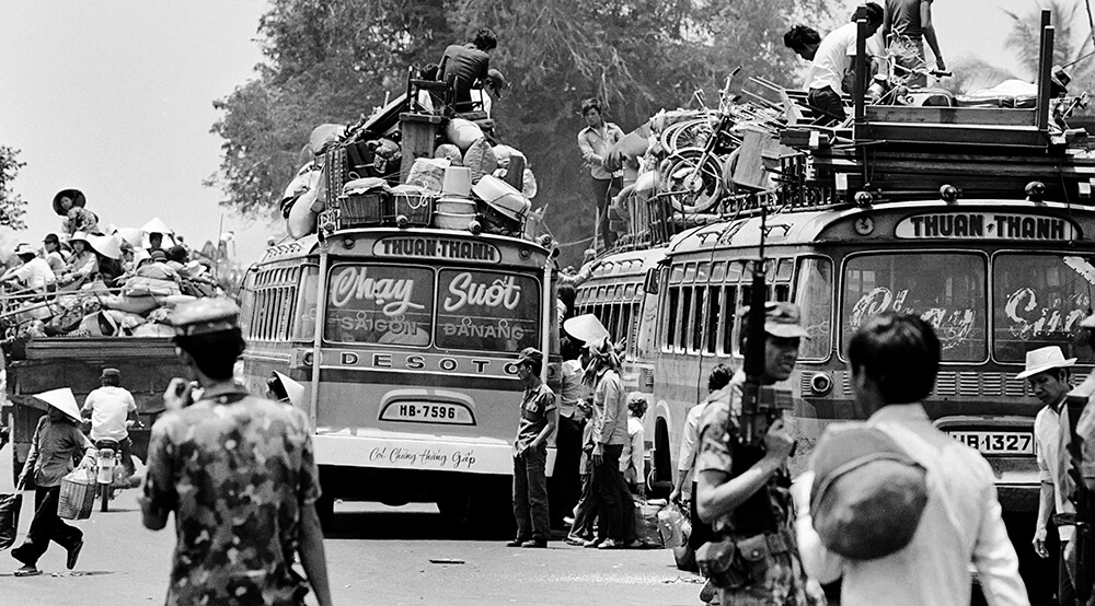 David Hume Kennerly, Vietnamese Civilians Boarding Buses and Trucks, Nha Trang, South Vietnam, 1975. © Bettmann/Getty Images