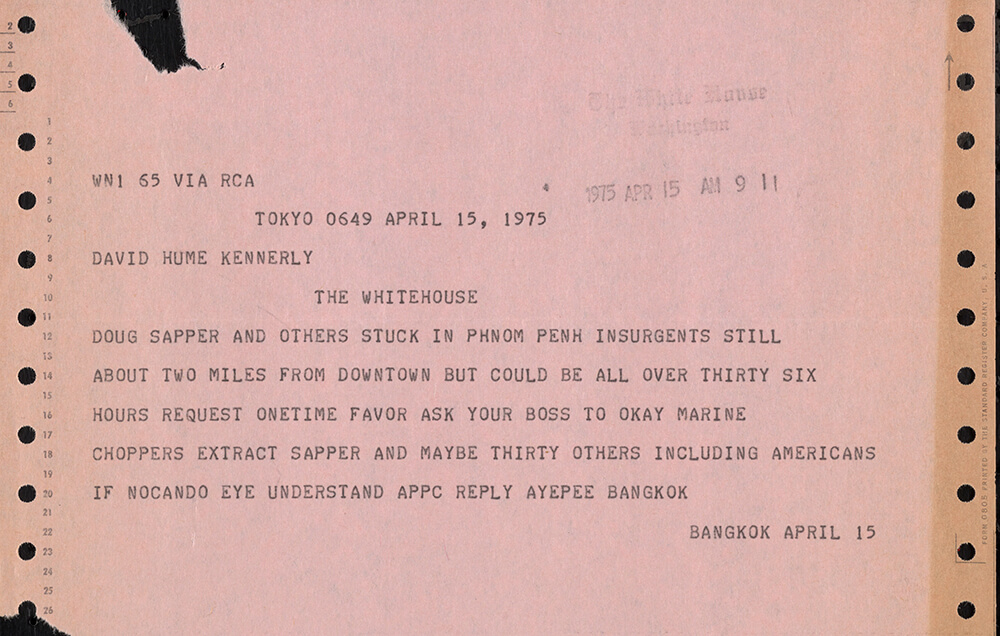 Telegram sent from David Hume Kennerly in Bangkok to the White House, April 15, 1975