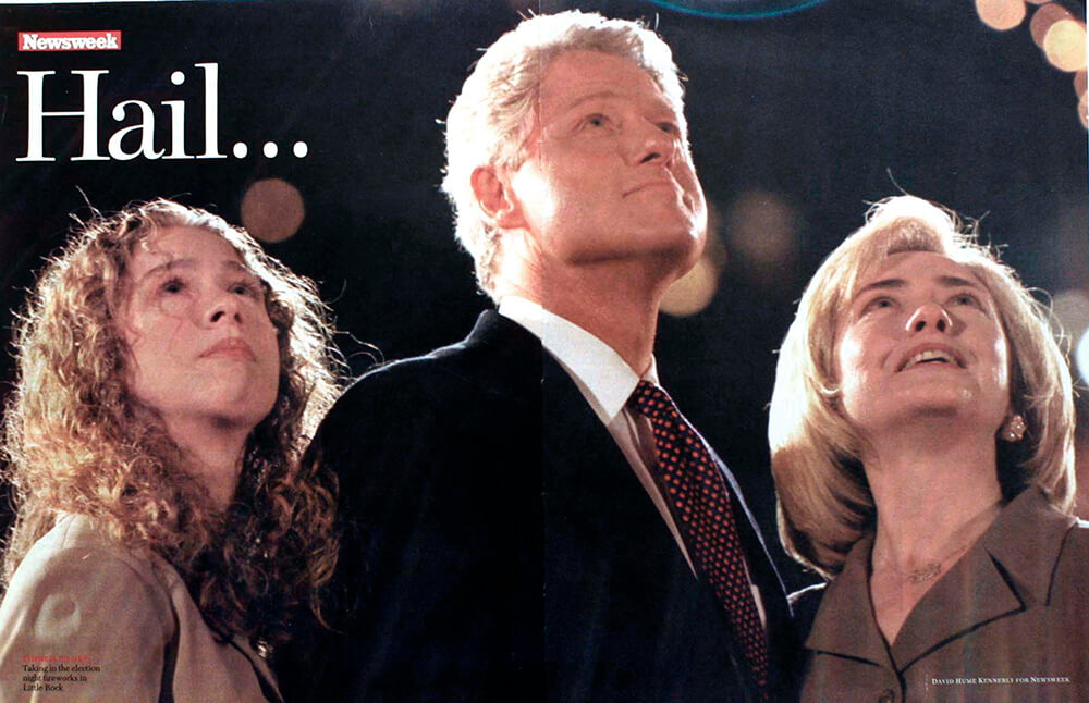 David Hume Kennerly, Bill Clinton, President; Hillary Clinton, First Lady; And Chelsea Clinton, Daughter, Watching Fireworks on Election Night, Little Rock, Arkansas, for a Newsweek Lead, 1996. Newsweek
