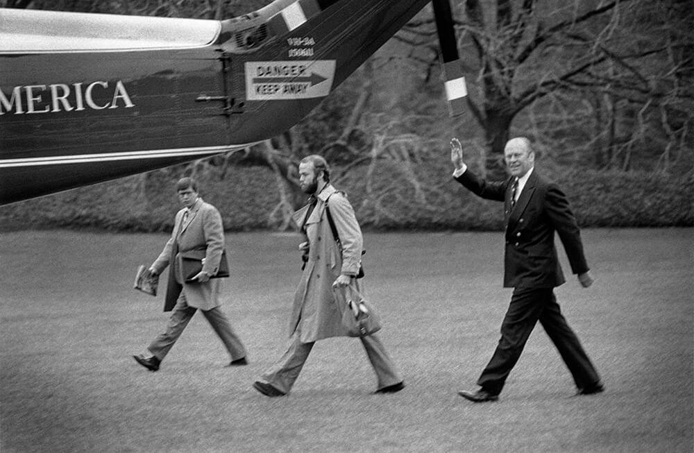 Gerald R. Ford, President; David Hume Kennerly, Photographer; And Terry O'Donnell, White House Aide, Walk Towards Marine One, White House South Lawn, Washington, D.C., 1976. White House photo