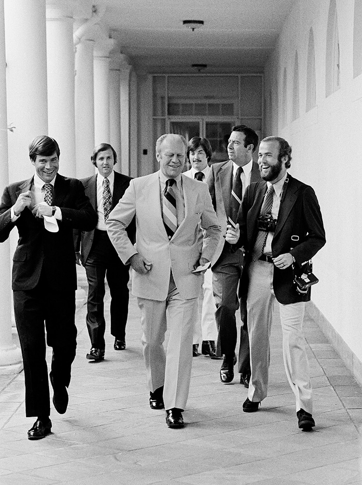 Gerald R. Ford, President; David Hume Kennerly, Photographer; And Terry O'Donnell, White House Aide, Walking with Secret Service Agents, White House, Washington, D.C., 1976. White House photo